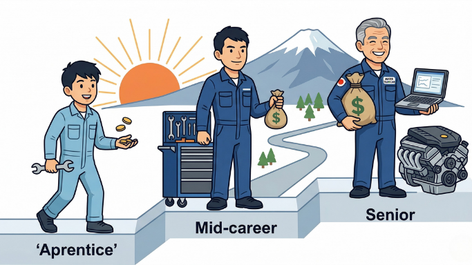 この時期は給与の絶対額よりも、二級整備士の資格取得や車種の幅を広げることが、5年後・10年後の年収を大きく左右します。